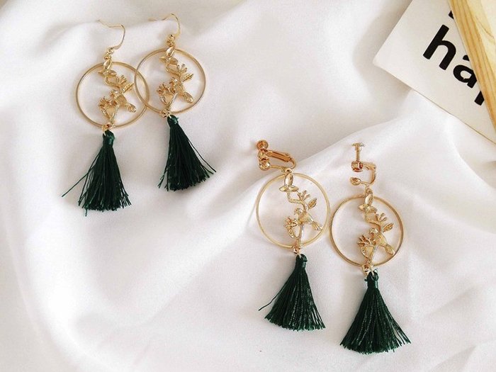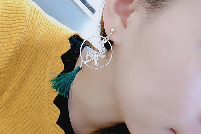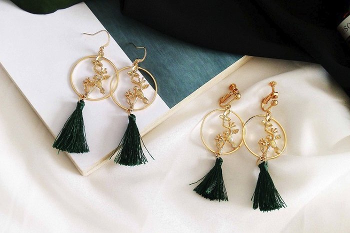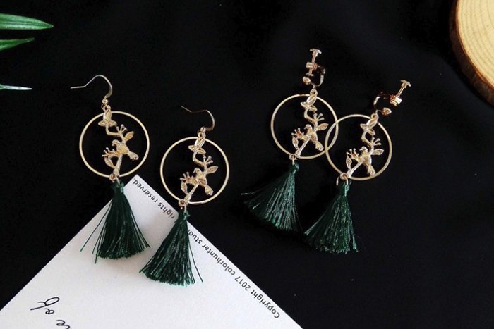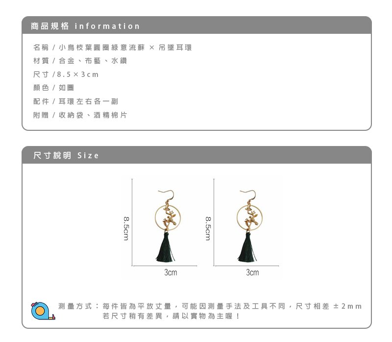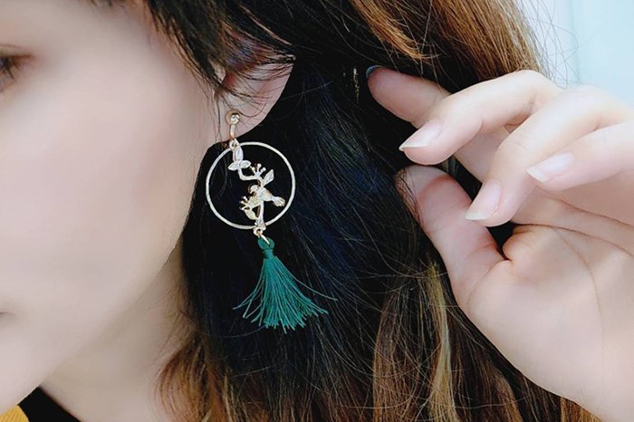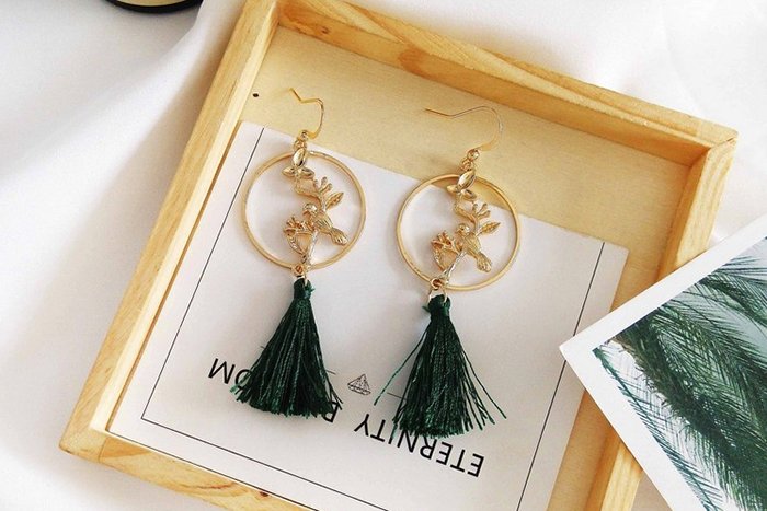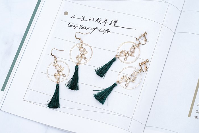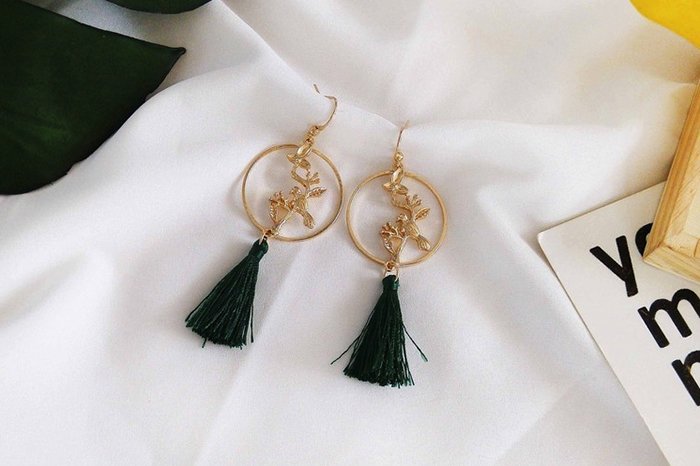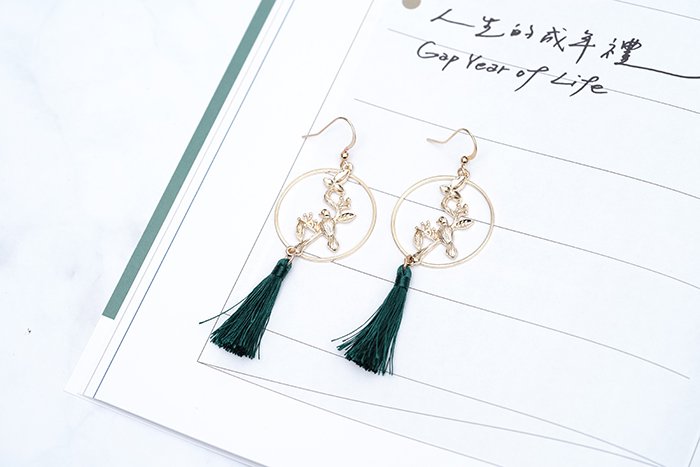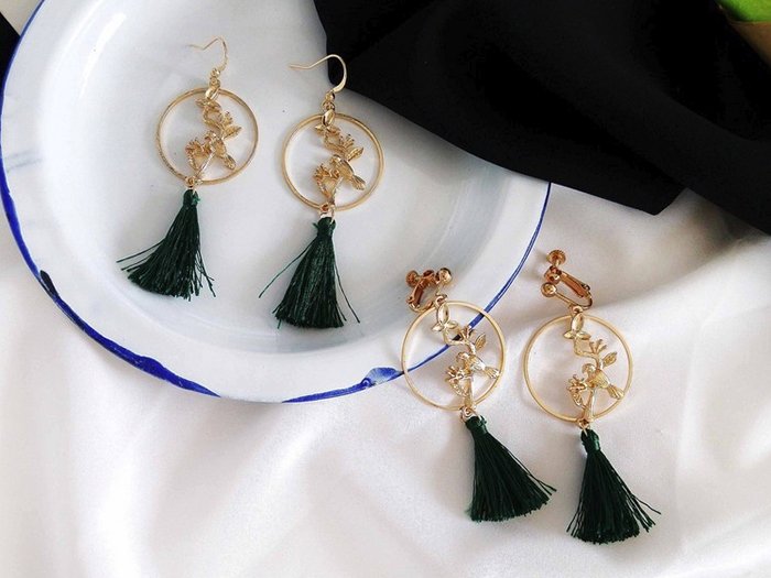 小鳥枝葉圓圈綠意流蘇×吊墜耳勾