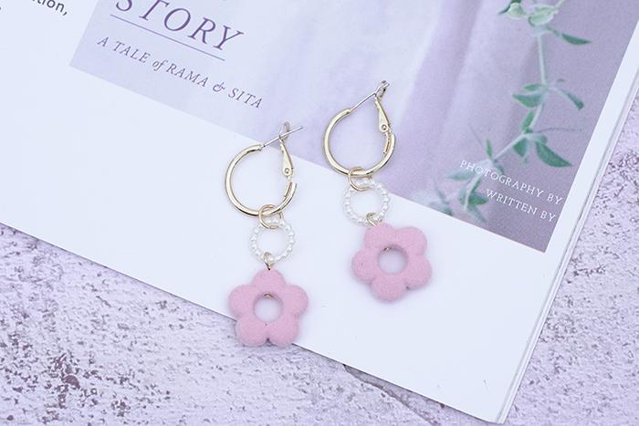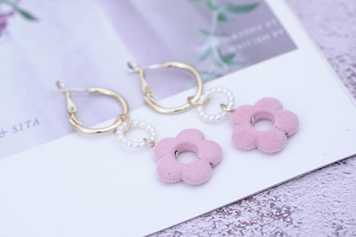 ▶名稱/粉花植絨圓環珍珠×吊墜耳扣