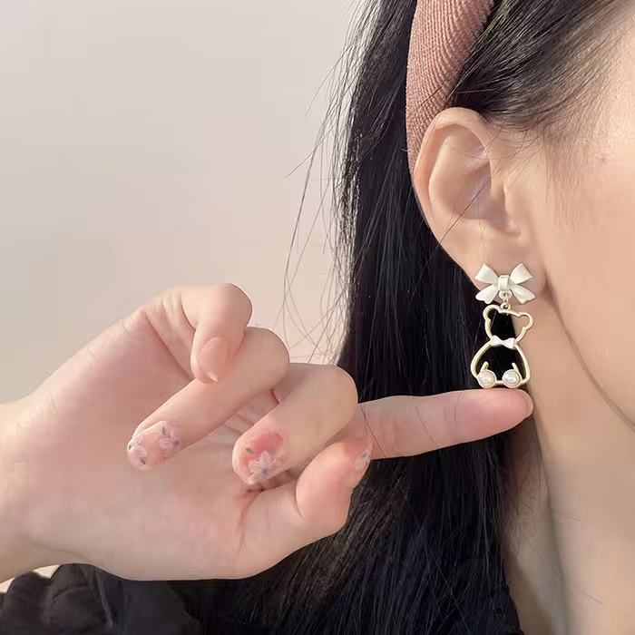 ▶名稱/白蝴蝶結小熊輪廓珍珠×吊墜耳環