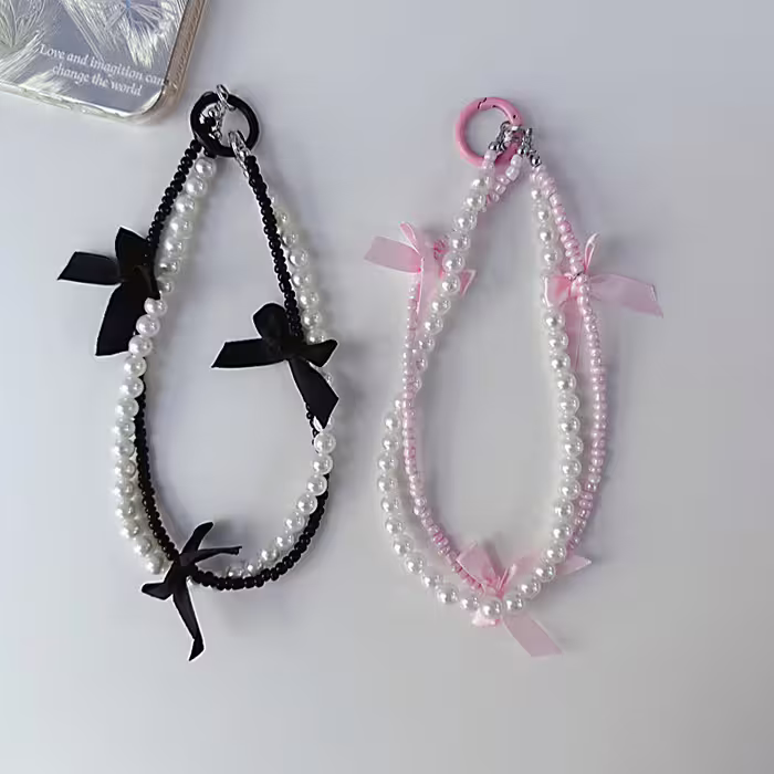芭蕾風蝴蝶結珍珠×雙層手機腕帶掛繩×粉色
